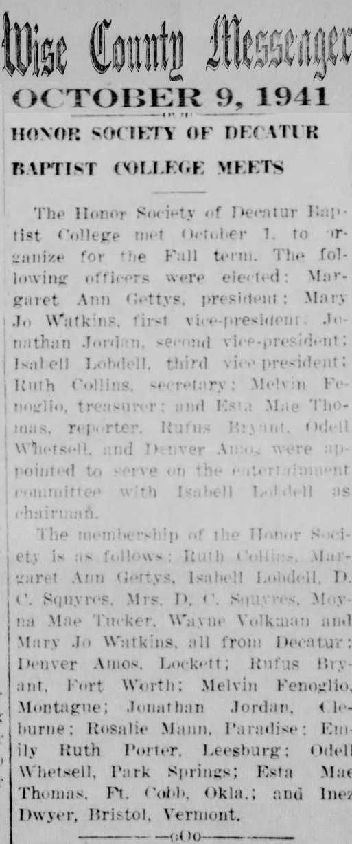Museum = Picture or Paper on File at the Wise County Heritage Museum)